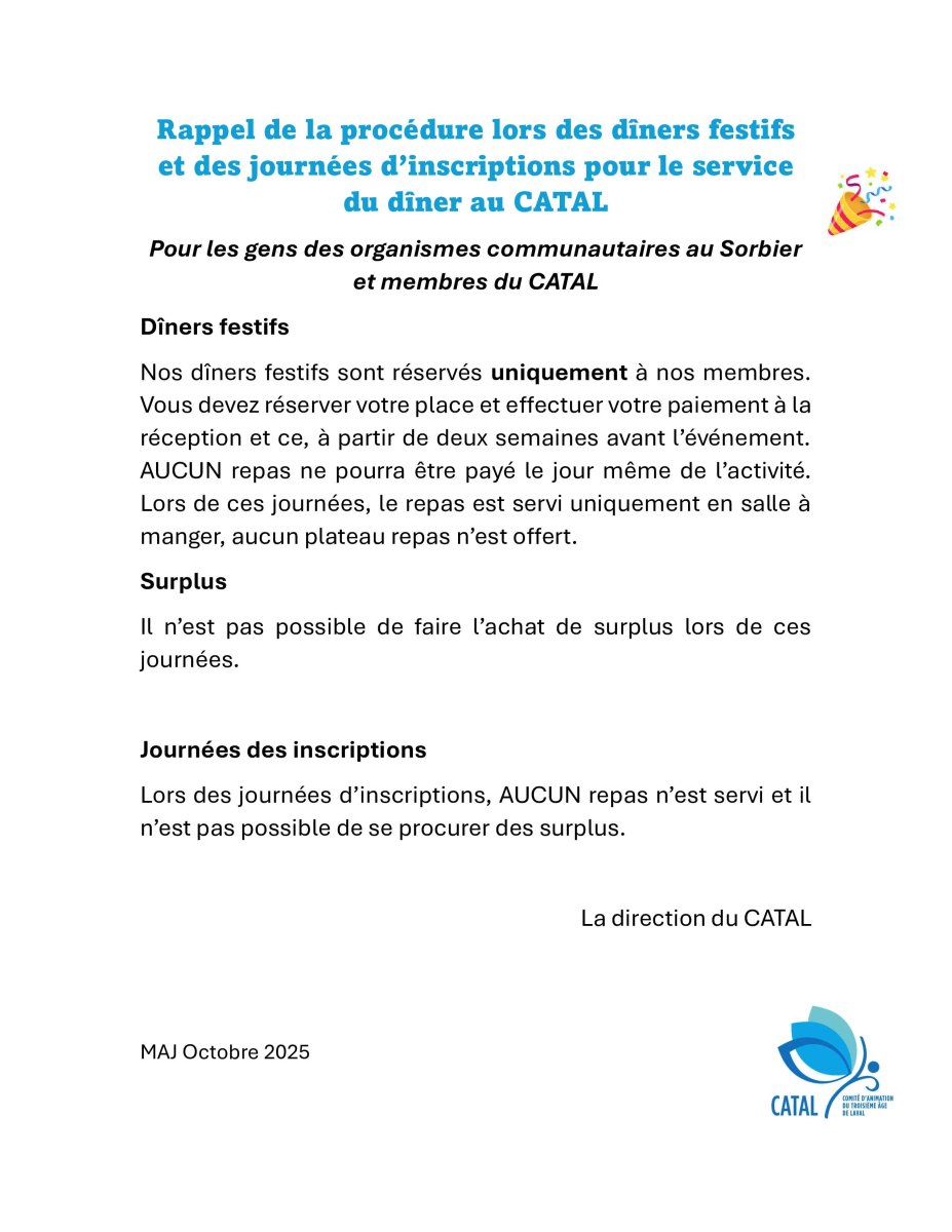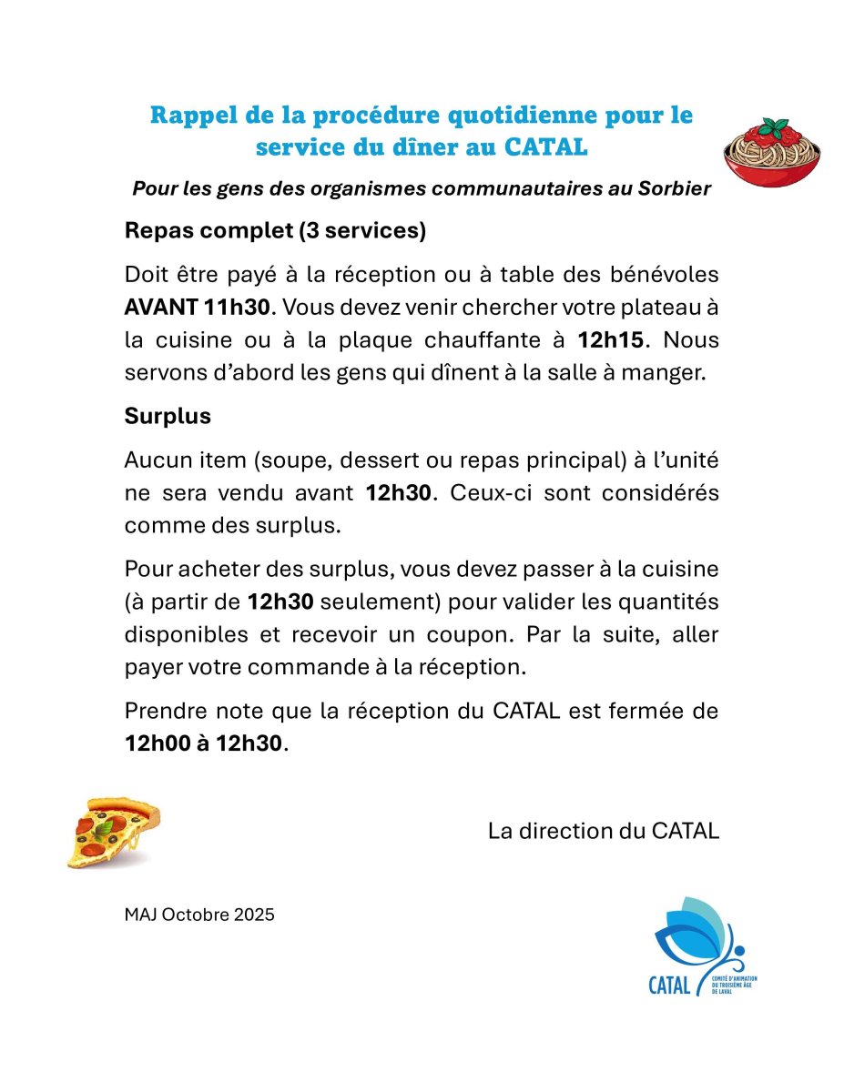 Le service de repas communautaire du CATAL offre des repas complets sains et nutritifs du lundi au jeudi dès 11 h 45. Les repas incluent entrée, plat principal et dessert. Le prix de nos repas est de 8 $ pour nos membres et 12 $ pour les non-membres.